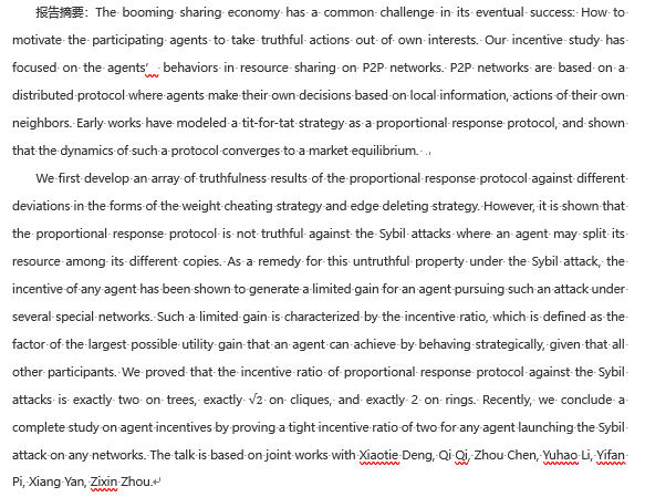 报告人简介:程郁琨,博士,苏州科技大学教授。IEEE Open Journal of Computer Society,《运筹学学报》等期刊编委,中国工业与应用数学区块链专委会副秘书长,中国运筹学会博弈论分会理事,中国运筹学会数学规划分会青年理事,江苏省运筹学会理事。主要研究领域为区块链技术与应用、信息经济学、算法博弈论、组合优化等。2010-2013年期间,在浙江大学从事博士后研究工作。2012-2013年,获国家留学基金委资助赴澳大利亚墨尔本大学访问。获2020年度国家科学技术学术著作出版基金;作为项目主持人,曾主持国家自然科学基金项目3项,主持省部级以上项目1项。获得2020年江苏省高校“青蓝工程”中青年学术带头人,2019年江苏省高校“青蓝工程”优秀青年骨干教师称号;获得2017年江苏省高等学校微课教学比赛二等奖,2018年江苏省本科高校青年教师教学竞赛二等奖。