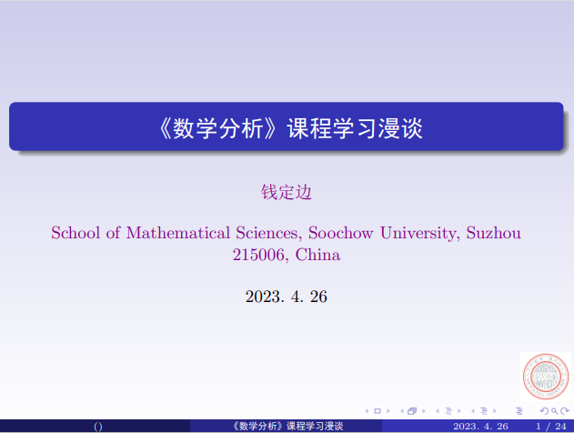 今天下午我认真听完了钱定边老师题为“《数学分析》课程学习漫谈”的报告,感觉受益匪浅。这是钱老师对他几十年学习和教授这门课程心得体会的一次总结,也是对学生和中青年教师的一次很好的教育。讲座中他还以周麒、王宝、葛剑等已在学术研究上取得突出成绩的优秀校友为例,鼓励学生要有自信心。特别地,钱老师还提到了选择好教材和参考书的重要性以及学习数学史的重要性,这确实是学生和青年教师非常容易忽视的地方。