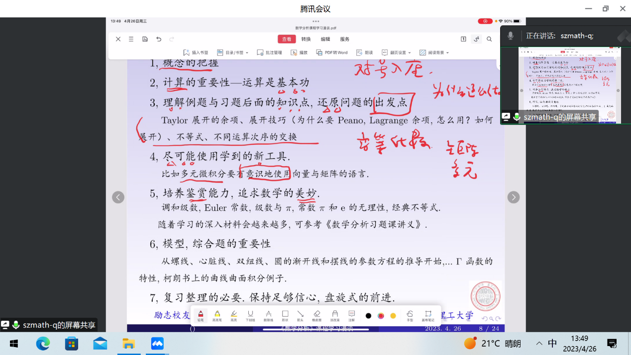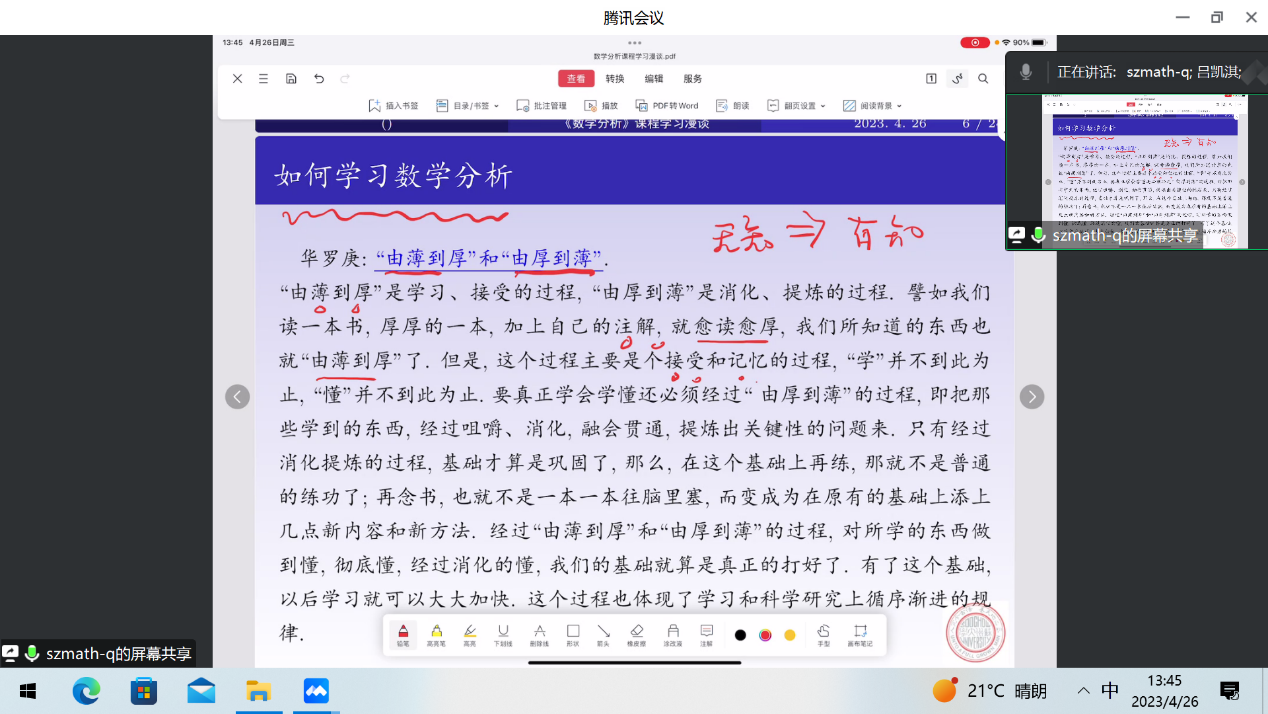 本次讲座,线下讲堂,同学们深感干货满满,受益绵长,不仅开阔了学术视野、提升了课程思维,收获了学好《数学分析》课程的全方位、立体式、多层次的学习指南,更是充盈了在专业学习上攀峰攻坚的精神力量,为大家坚定学好数学、用好数学,为不断成长、报效祖国扎实了专业基础、坚定了理想信念。腾讯线上,老师们受益匪浅之际,纷纷在课程群内,由衷感叹钱老师在精湛教学、奖掖后学上的兢兢业业、不辞辛劳!