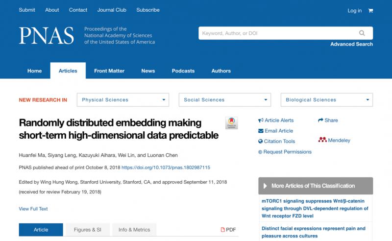2018年10月8日,国际著名综合类科学期刊《美国科学院院刊》(PNAS)在线发表了苏州大学数学科学学院系统生物学研究中心马欢飞副教授研究课题组的题为“Randomly Distributed Embedding Making Short-termHigh-dimensional Data Predictable”的最新研究论文(自由投稿渠道),马欢飞副教授是该论文第一作者,苏州大学数学科学学院是唯一第一作者单位。PNAS与Cell,Nature,Science被公认为世界四大著名科学期刊,这是我校首次在PNAS发表数学类论文。
