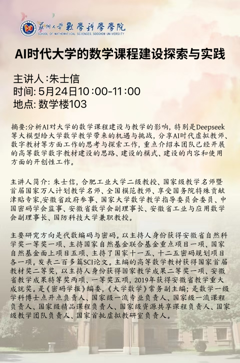 学术报告(5.24)朱士信:AI时代大学的数学课程建设探索与实践