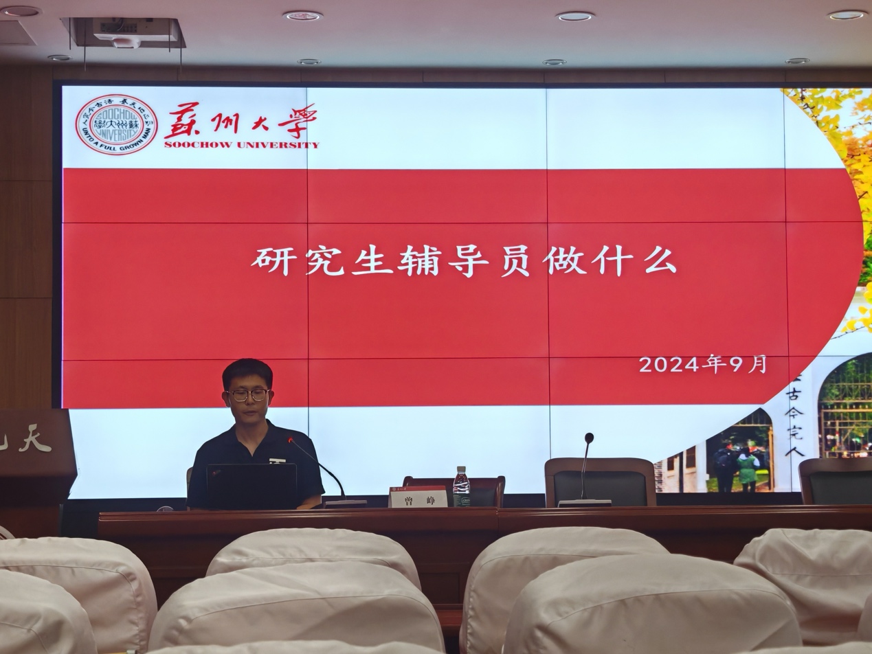 为进一步加强研究生思想政治教育,帮助同学们准确把握时代脉搏,自觉承担家国责任,传承苏州大学优良精神,并积极适应研究生阶段的科研学习和生活,我院于9月12日下午14:00在天元讲堂开展了2024级研究生入学教育会议。本次会议由2024级研究生辅导员曾峥主持,学院党委书记逢成华、副院长王志国、教务秘书王梦婷出席,全体2024级研究生参加本次会议。