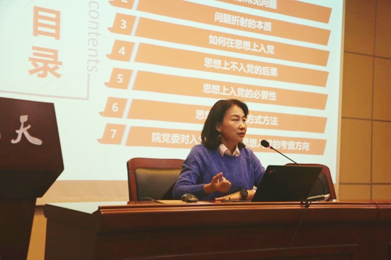 蒋老师从发展党员中的常见问题入手,为同学们分析了问题折射的本质,并向同学们展示了思想上不入党的后果。针对积极要求进步的新同学,蒋老师讲述了思想上入党的必要性,指出从认真学习党章开始,引用习近平总书记在中央党校(国家行政学院)中青年干部培训班开班仪式上的重要讲话,要求同学们“在常学常新中加强理论修养,在真学真信中坚定理想信念,在学思践悟中牢记初心使命,在细照笃行中不断修炼自我,在知行合一中主动担当作为,保持对党的忠诚心,对人民的感恩心,对事业的进取心,对法纪的敬畏心,做到信念坚、政治强、本领高、作风硬。” 引用民主革命时期,毛泽东同志把马克思主义建党学说同中国共产党建设实际相结合,创造性地提出着重从思想上建党的原则,强调党员不仅要在组织上入党,而且更要在思想上入党。阐明了每个入党积极分子和党员在思想上入党,对党的建设的重要性和必要性。蒋老师从如何坚定理想信念、如何增强理论自信、如何坚持统一思想、如何从榜样中汲取前进的力量等方面,结合实例给同学们指明了思想上入党的方式方法,并推荐了学习平台和优秀视频节目。