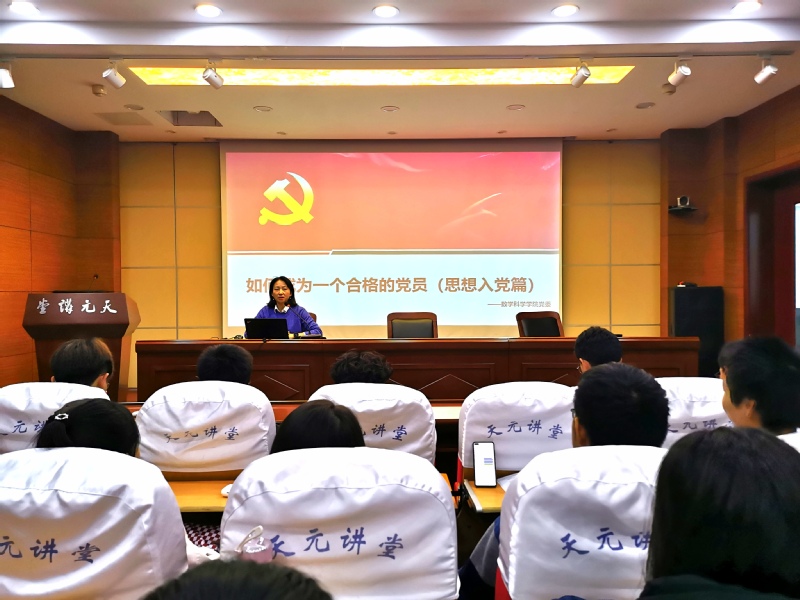 最后,蒋老师表达了对同学们提高思想觉悟以及端正思想态度的要求与期待,给同学们介绍了组织上入党的顺序和必经程序,并具体讲解了学院党组织对入党积极分子考察的一些途径路向和检验标准,勉励各位首先要立志在思想上入党,也要努力在组织上入党。她鼓励新生,结合院分党校、分团校的培训,应该就如何在行动上入党展开积极讨论和实践,努力提升数学科学学院全体同学的政治素质和全心全意为人民服务的能力。蒋老师希望未来同学们能够更好的继承和发扬党的优良传统,为社会、国家作出贡献。