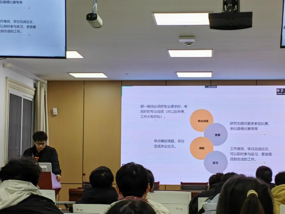 韩善恒同学从学业、科研以及未来规划方面进行了详细的分享。谈及学业成绩,他提到研究生期间应该明确不同阶段的目标和任务。对于课题的研究,韩善恒同学从自我经历出发,和大家分享了选择课题时应结合自己的兴趣和导师的意见,并鼓励大家利用研讨会、学术会议等活动,主动讨论心得,激发自己在科研领域方面的灵感。此外,韩善恒同学结合身边同学的实例,鼓励大家及早确定职业规划并为之努力。
