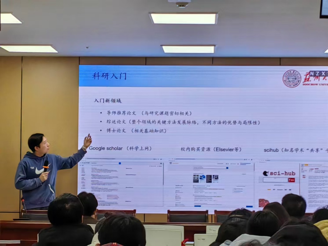 温泽鹏同学则主要分享了自己的科研心得与体会。他详细介绍了在阅读论文时的科学顺序,并传授了如何最大程度地利用现有的资源,实现科学上网,快速获取所需资料的技巧。除了科研之外,温泽鹏同学还提醒大家步入研究生阶段后心态的积极转换,增强自主推进工作进度和主动提升自我能力的意识,以更好适应研究生阶段的学习和研究。