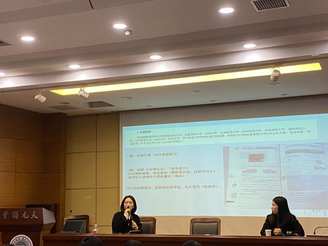 之后,耿静和陆坚清进行求职分享,这两位是我院2018级研究生,是参加了苏州大学的“优秀实习生项目”并且在实习期间表现优异的优秀学生,现在分别被西安交通大学附属中学和园区星海中学拟招聘为数学教师。他们分享了自己参加“优秀实习生项目”的心路历程,并介绍了现在的就业情况和趋势,给学弟学妹们加油打气,希望大家都早为求职做准备。