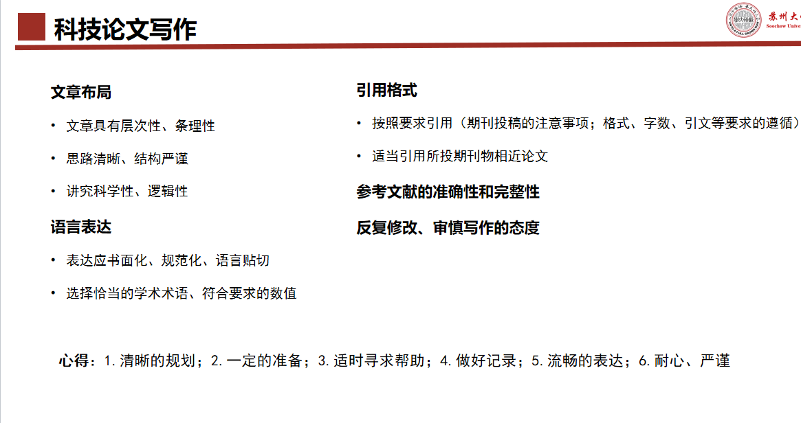 并且指出科技论文写作中的语言表达,参考文献的准确性和完整性,一篇论文的完成需要审慎写作,反复修改。在写作过程中,要多与导师和朋辈交流,碰撞思想火花,汲取科研养分。另外,论文写作是个耗时较长且磨练意志的过程,要不断给自己信心,坚定科研目标并为之不懈努力。