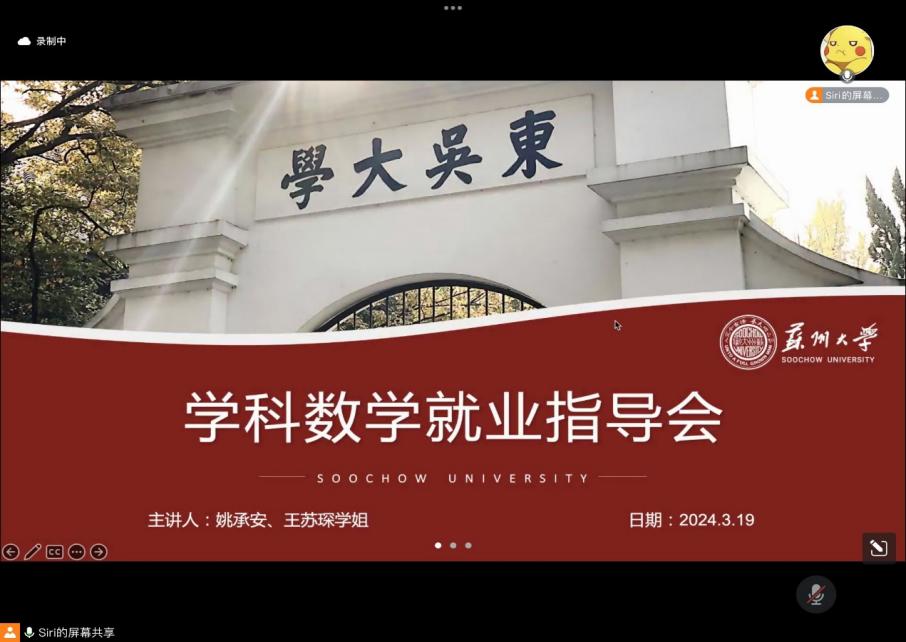 为提升我院研究生就业经验,我院于2024年3月19日晚开展了学科教学(数学)专业就业指导系列讲座。本次讲座通过腾讯会议在线召开,特邀请学科教学(数学)专业姚承安同学、王苏琛同学做就业分享,讲座由研究生专职辅导员曾峥老师主持。