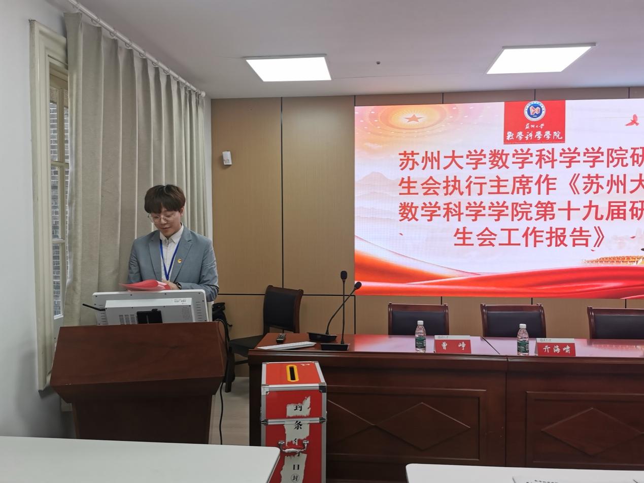 正式会议中,院研究生会执行主席陈龙潜同学代表第十八届研究生委员会作《苏州大学数学科学学院第十八届研究生会工作报告》。与会代表分别审议通过了《苏州大学数学科学学院研究生会章程(2024年修订案)》、大会选举办法、监票人、计票人名单。与会代表根据大会选举办法,坚持公平公正的原则,经无记名投票选举新一届数学科学学院研究生会主席团、研究生委员会。