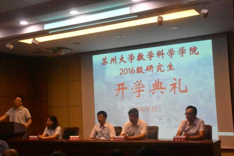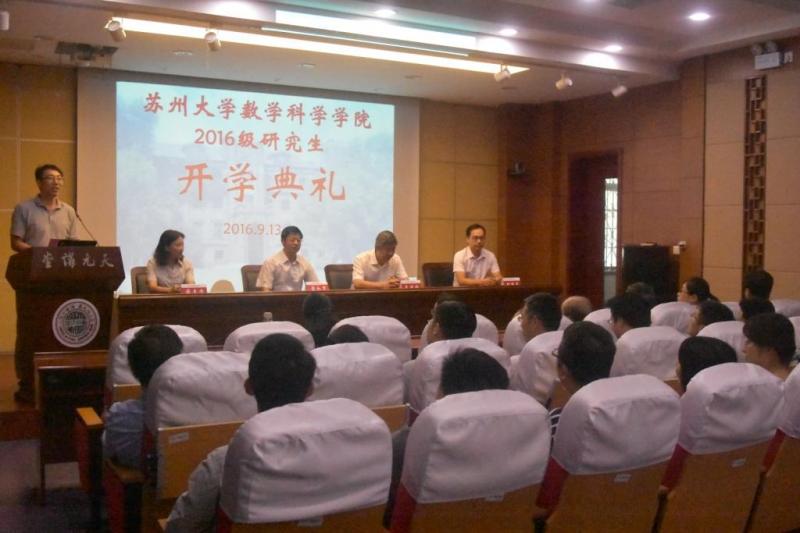 数学科学学院2016级研究生开学典礼于2016年9月13日在天元讲堂举行。院长曹永罗、党委书记朱建刚、副书记、副院长蒋青芳、副院长顾振华等学院党政领导、学院三十余名博士、硕士研究生导师以及2016级全体研究生参加了开学典礼。 开学典礼由院长助理王志国主持。