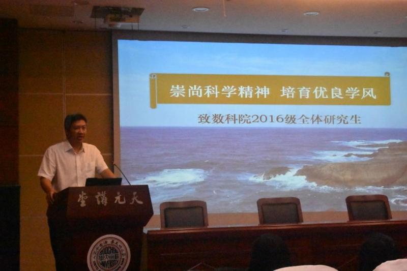 开学典礼结束后,院党委书记朱建刚以《崇尚科学精神 培育优良学风》为题给2016级研究生上了新生第一课。课上,朱书记为大家介绍了苏大的历史与现状,并结合学院近80年的办学历史介绍,勉励大家继承传统、刻苦钻研,他希望2016级全体研究生在学习科研过程中要崇尚科学精神,努力培育数科院特有的优良学风。