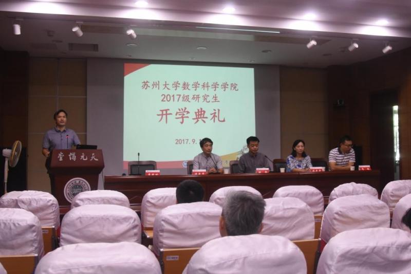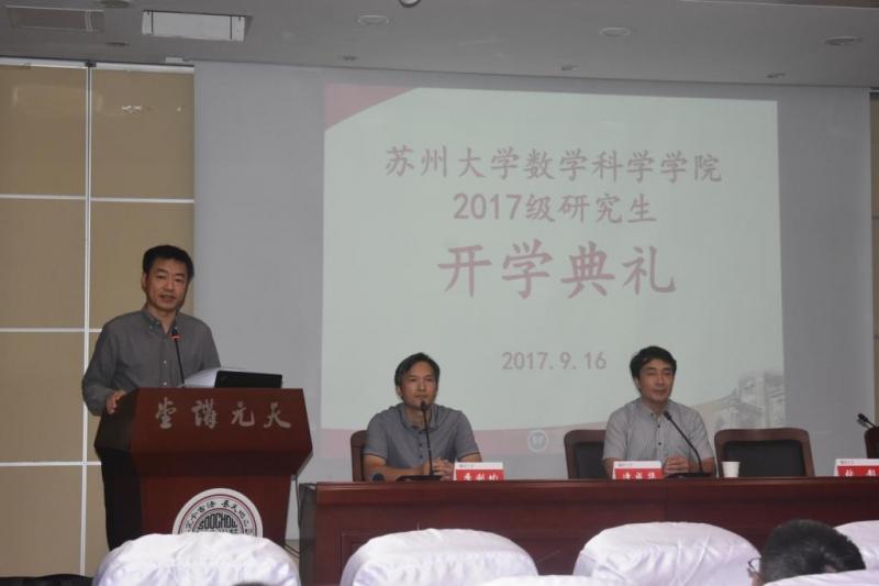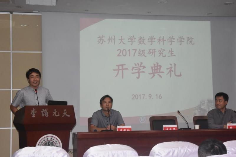 数学科学学院2017级研究生开学典礼于2017年9月16日在天元讲堂举行。院长张影、党委书记逢成华、副书记、副院长蒋青芳、副院长李振、副院长季利均等学院党政领导、学院十余名博士、硕士研究生导师以及2017级全体研究生参加了开学典礼。开学典礼由副院长季利均教授主持。