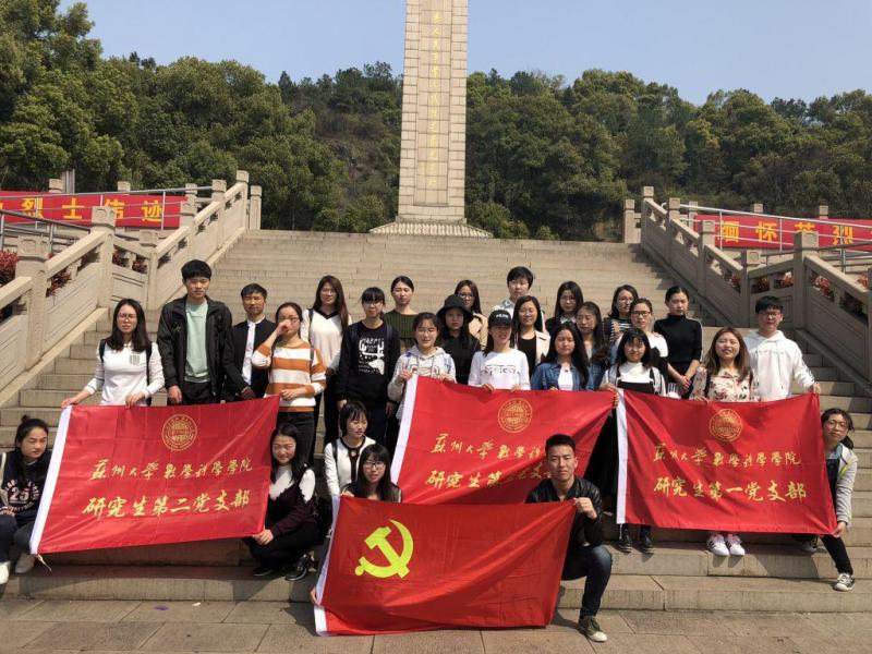 为提醒我院党员时刻铭记烈士们为解放国家和民族而不惜牺牲生命的大无畏精神,培养党员及入党积极分子的爱国情怀、严谨治学的态度和发奋学习的精神,2018年3月28日下午,苏州大学数科院研究生第一党支部携手数科院研究生第二、三党支部30人赴苏州烈士陵园,开展“忆革命先烈,思奋发图强”为主题的扫墓活动。