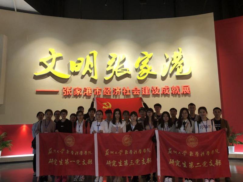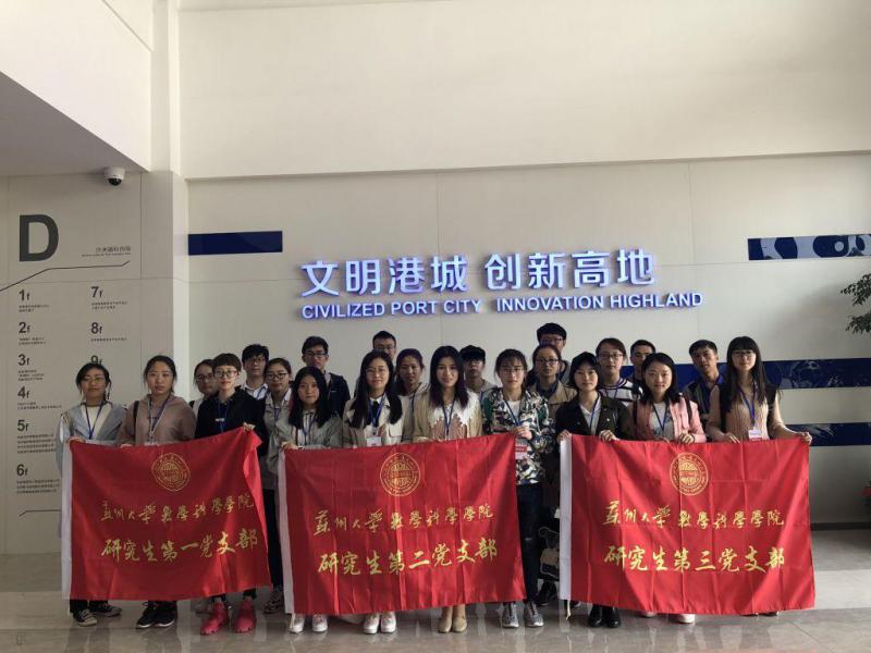 为进一步拓宽我院研究生党员的视野、增强我院各党支部的凝聚力,2018年4月25日,苏州大学数科院研究生第一、第二和第三党支部携手开展团队主题党日活动。在数科院第一党支部副书记尤彪、第三党支部书记钱月凤的带领下,一行20余人赴张家港进行参观学习。
