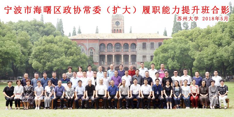 5月28日到6月1日,宁波市海曙区政协常委(扩大)履职能力提升班在我院精正楼二楼学术报告厅顺利举办。来自宁波市海曙区政协等部门的60人参加了此次培训。宁波市海曙区政协主席、党组书记毕东华、海曙区政协副书记、党组成员郁利祥和苏州大学副校长刘标参加了开班典礼。郁利祥主持了开班典礼,刘标副校长代表苏州大学对来自宁波市海曙区政协的领导和全体学员表示了热烈欢迎并介绍了苏州大学的发展历史、科学研究、人才培养等情况,毕东华主席做了开班动员讲话。