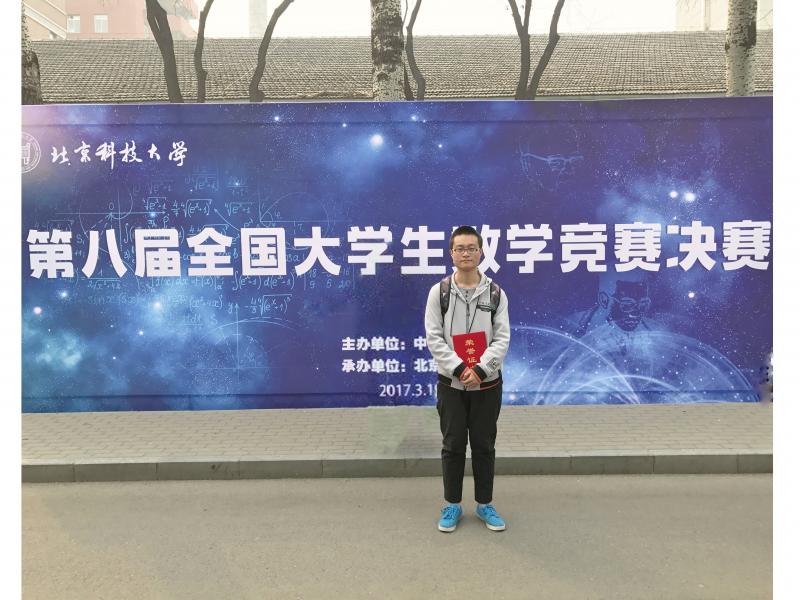 3月17日,由中国数学会主办,北京科技大学承办的“第八届全国大学生数学竞赛决赛”如期举行,数学科学学院2013级基地专业李祥飞同学作为江苏赛区选手参赛。3月19日,在北京科技大学校教工礼堂举办的大赛颁奖典礼上,李祥飞上台领取了决赛(数学专业)一等奖证书。