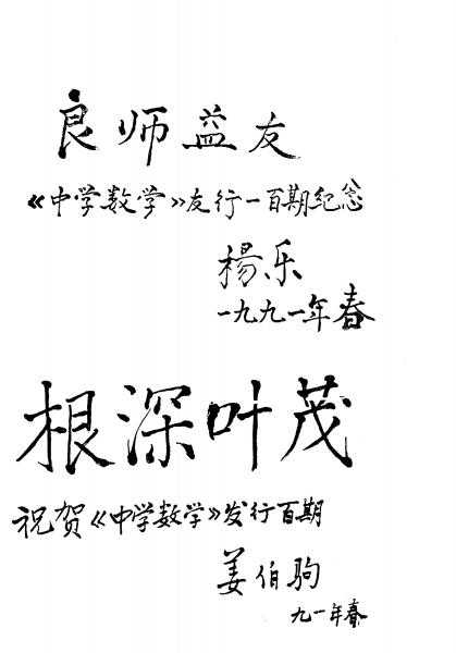 1991年,时值本刊创刊100期,许多著名的数学家,如程民德、谷超豪、杨乐、姜伯驹、姜礼尚、齐民友、潘承洞、胡和生、萧树铁、周伯壎等纷纷表示祝贺并题了词(题词曾发表在本刊1991年第9期).